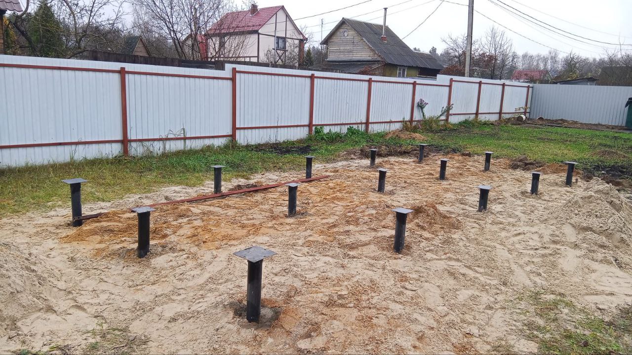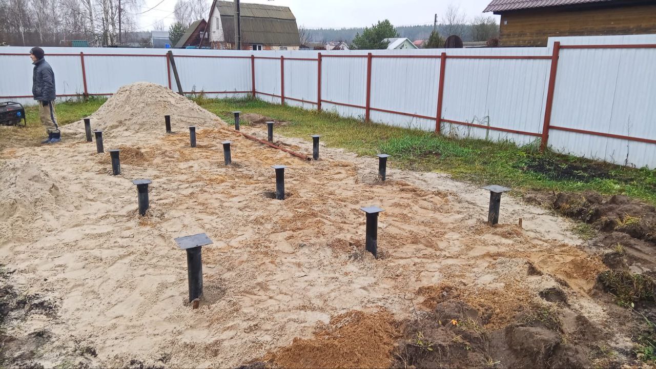 В назначенный день наша монтажная бригада прибыла на участок в Московской области. Первым делом была выполнена точная разметка свайного поля в соответствии с проектом. Для данного объекта наши инженеры рассчитали, что оптимальным решением будет использование 15 винтовых свай.